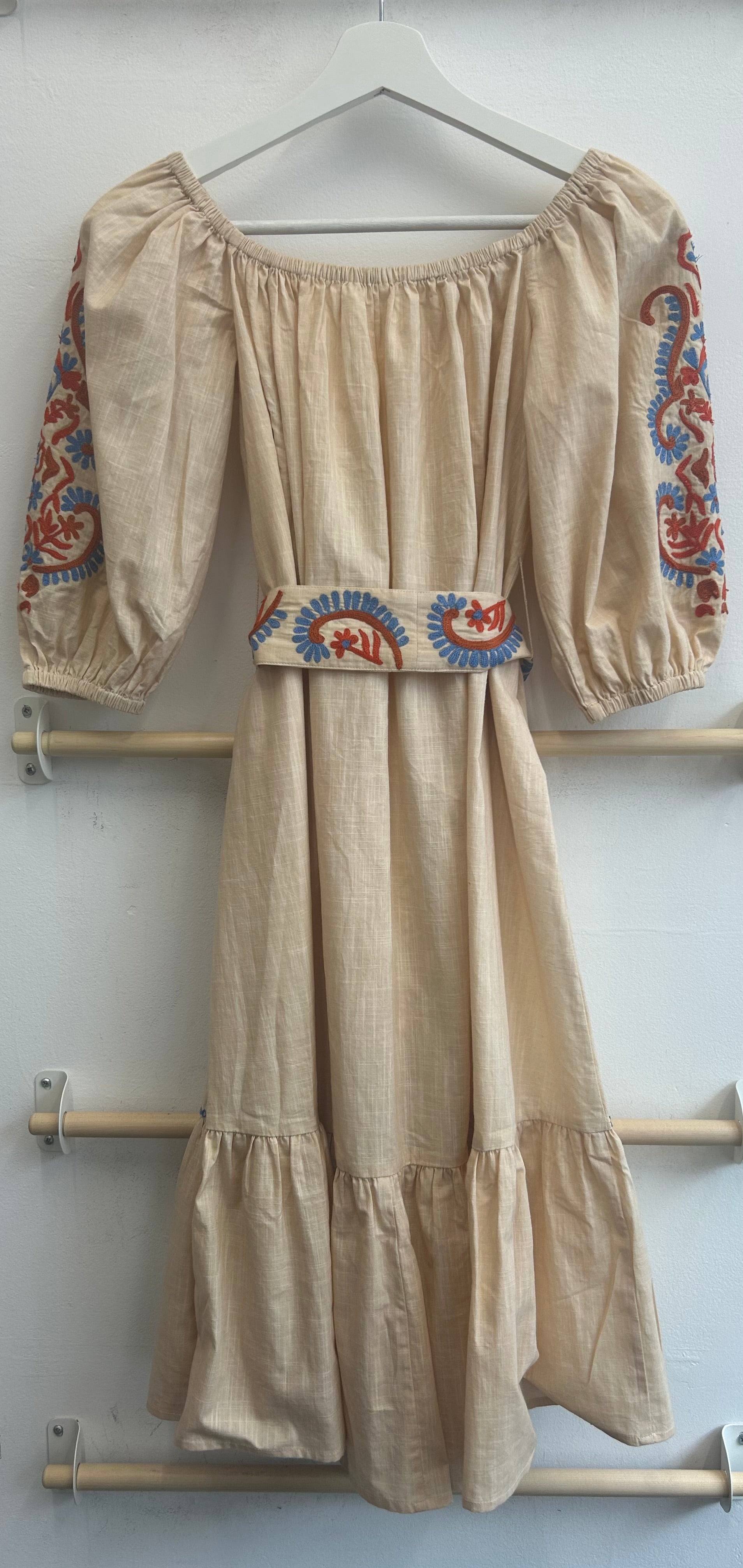 Stay stylish and comfortable this summer in our one-of-a-kind embroidered dress. Made from 100% cotton, the knee-length dress features beautiful balloon sleeves and a flattering belt tie. The elasticated neckline allows for versatile styling, on or off the shoulder. Available in size small.